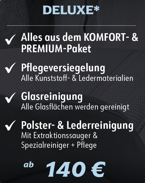 Das Deluxe-Paket kombiniert alle Leistungen aus dem Komfort- und Premium-Paket und ergänzt sie um hochwertige Pflege-Extras.