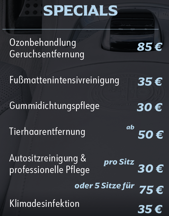 Neben unseren regulären Paketen bieten wir Ihnen flexible Extra-Specials, die Sie nach Belieben zu Ihrer Fahrzeugreinigung hinzubuchen können.