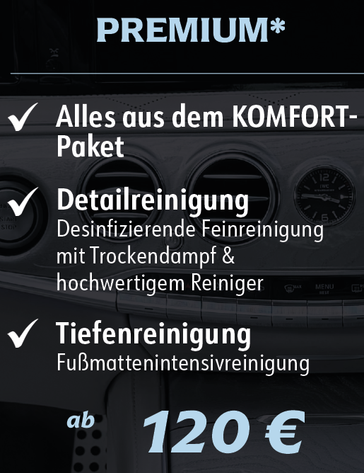 Das Deluxe-Paket ist die beste Wahl für alle, die ihrem Fahrzeug eine vollständige Innenraumaufbereitung auf höchstem Niveau gönnen möchten.